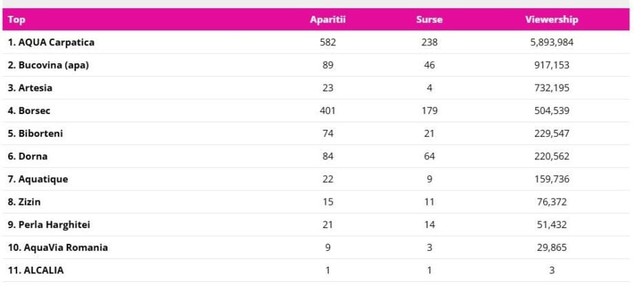 AQUA Carpatica este lider în topul celor mai vizibile branduri de apă atât în online, cât și pe Facebook în luna februarie 2025, informează iqads.ro.